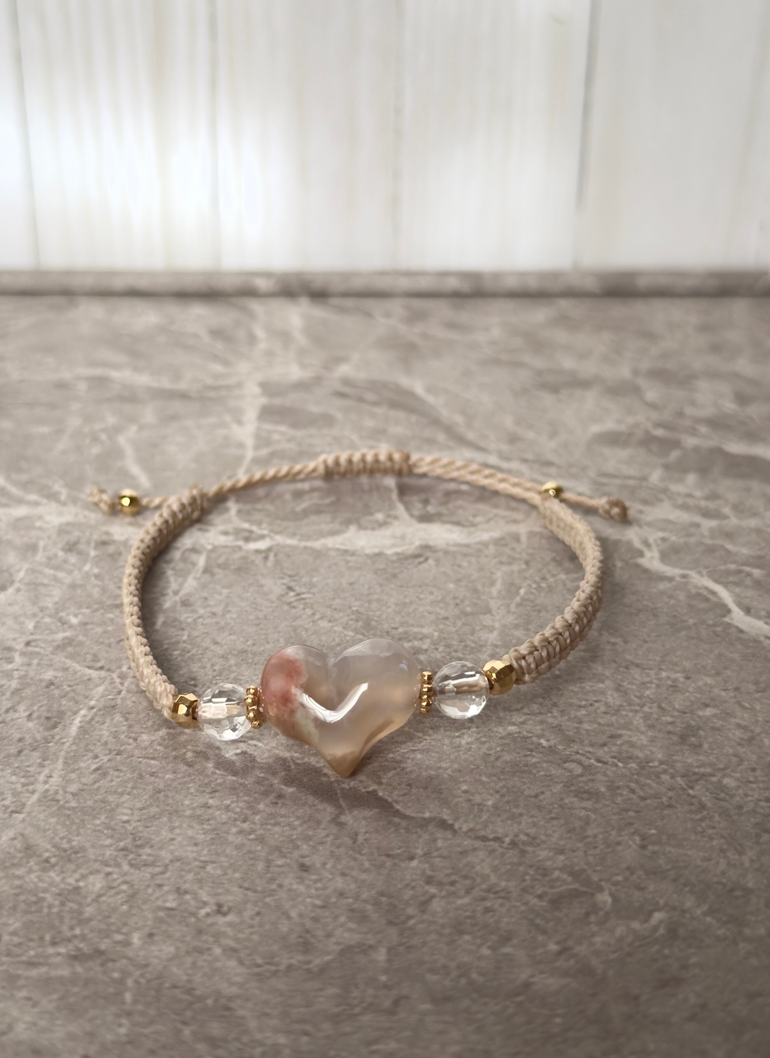 桜瑪瑙のハート型にカット水晶を組み合わせたマクラメブレスレットです。