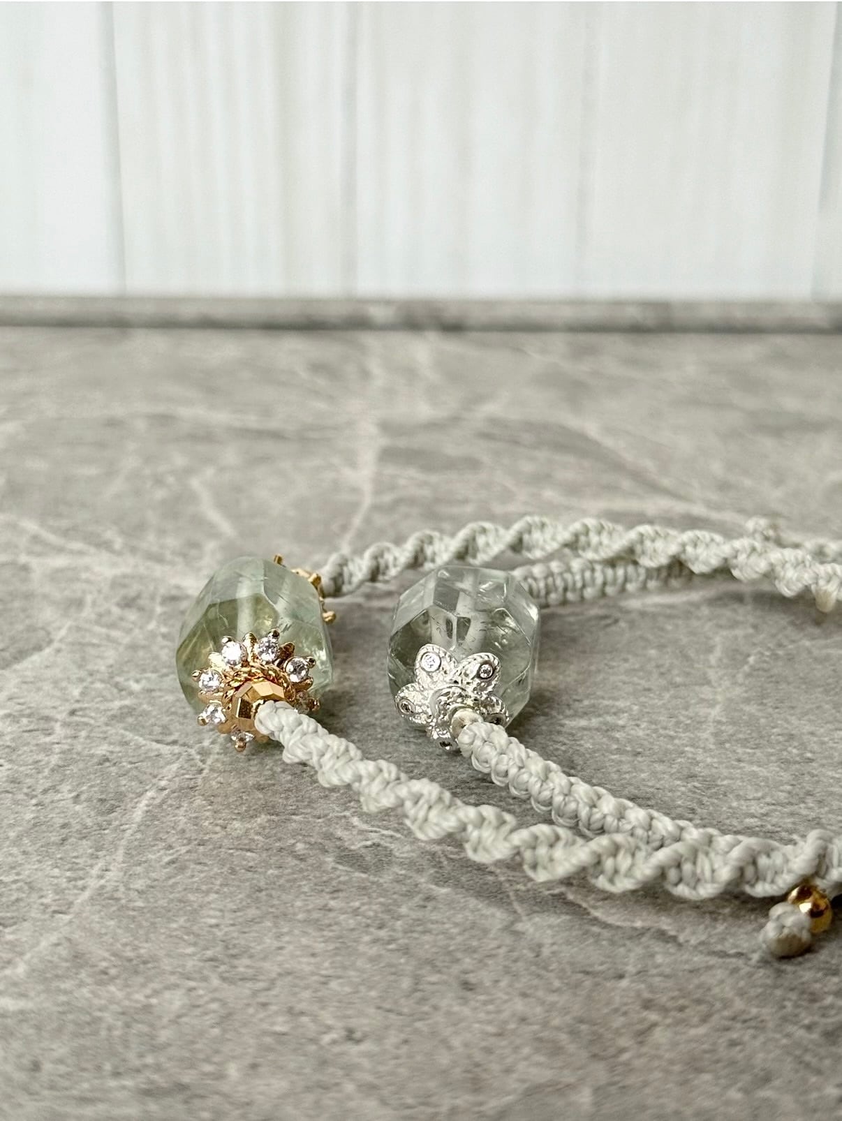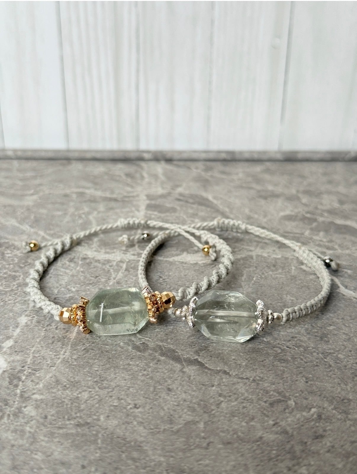 爽やかなグリーンアメジスト(プラシオライト)を使用したフリーカットのマクラメブレスレットです。